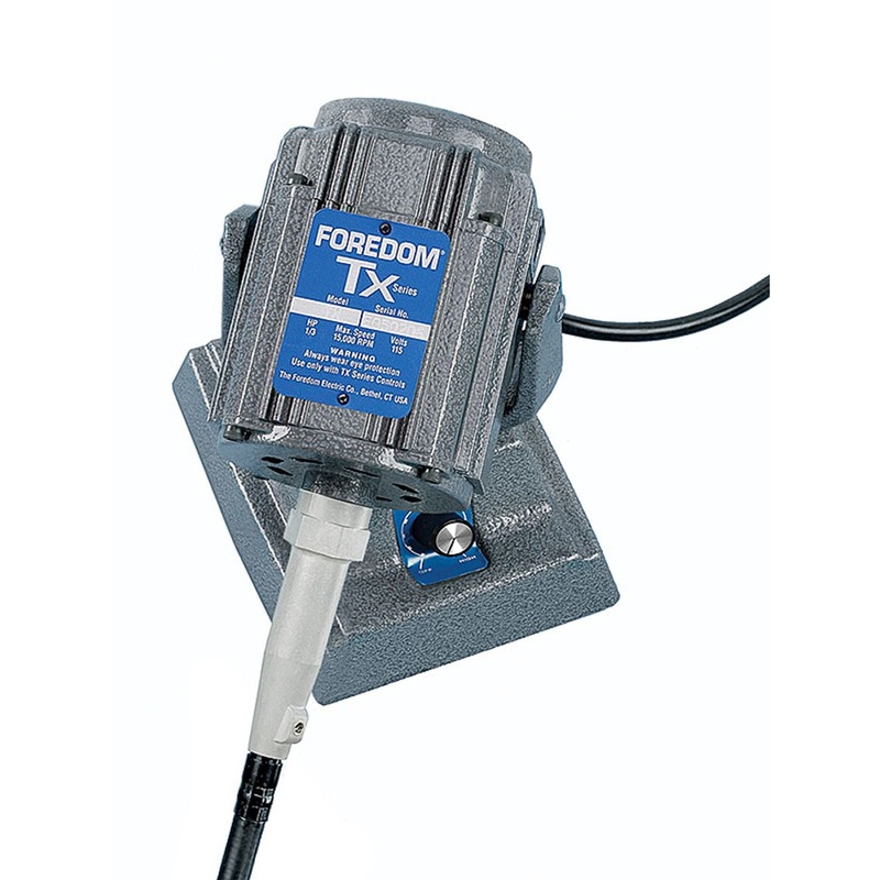 Here a bench style version of Foredoms 1/3 HP SeriesTX motorhas an integrated dial speed control built into its cast-iron base for manual speed adjustment and easy placement anywhere on the workbench. Two Year Limited Warranty on Motor and Control. M.TXM M