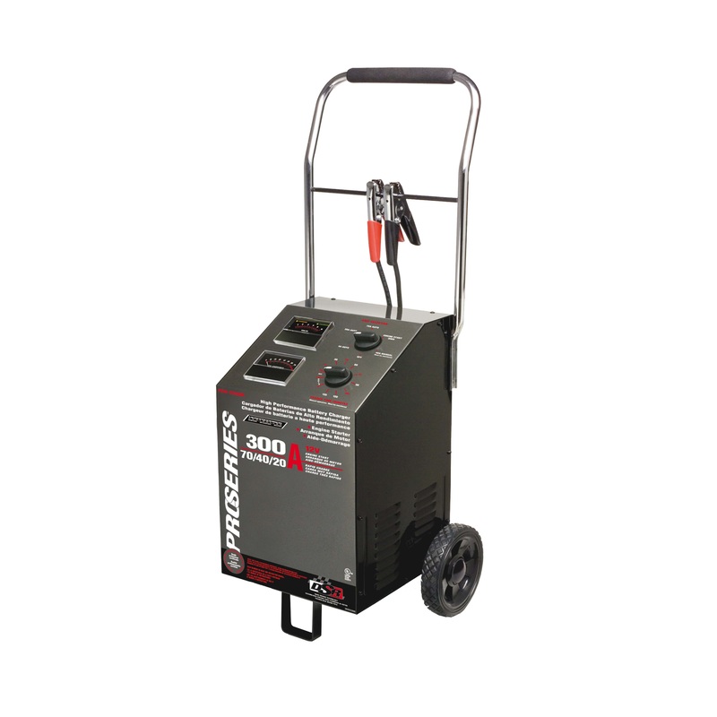 This high performance charger operates as fully automatically or manually. For charging 12V battery systems, the unit offers over-sized heavy-duty selector switches and rotary output switch selects between, 300 Amp engine start, 70 Amp rapid charge, 40 and 20 Amp fast charge and 4 Amp slow charge. The precision timer controlled operation offers a 2.25 hour timer with Off and Hold positions for controlled or continuous recharging. Large face, clear view ampere and volt meters have easy to read graduated scales. The tubular chrome plated handle has a rubber grip and unique non-conductive clamp rest. Includes an array of clamps and cables, 600 Amp heavy duty, chrome plated steel ultra grip clamps, 6-foot long heavy duty commercial gauge welding grade cables and extra long 9 foot AC line cord. A high volume cooling fan makes for efficient cooling and longer duty cycles. This unit is a durable, heavy duty steel cabinet with wide track wheels.