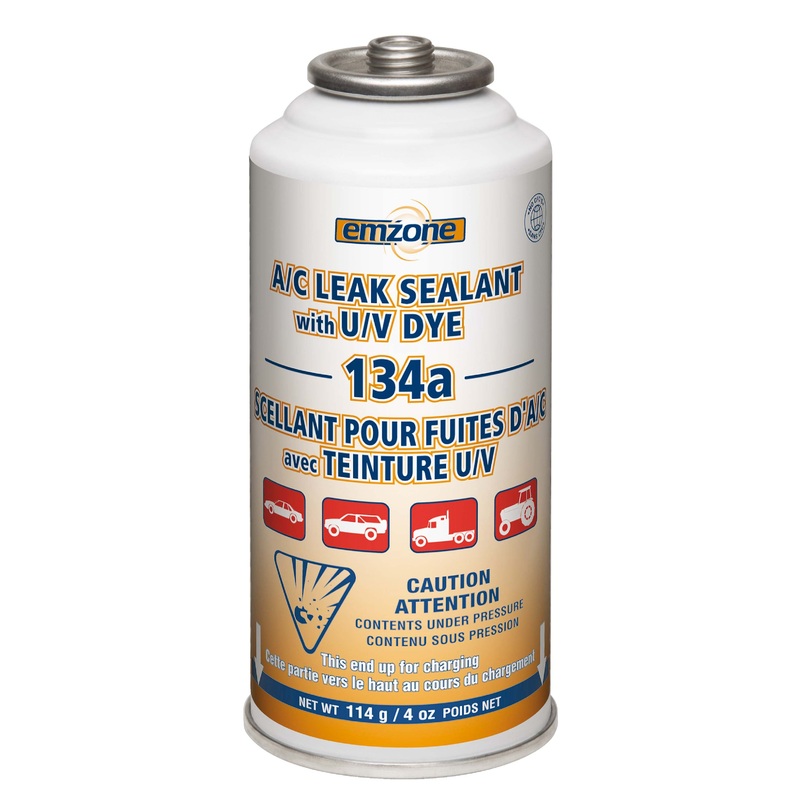 emzone 134a A/C Leak Sealant with U/V Dye has been formulated to repair leaks, and condition o-rings, automotive air conditioning system hoses, and gaskets. For mechanical leaks, a U/V dye pinpoints the leak so it may be repaired.