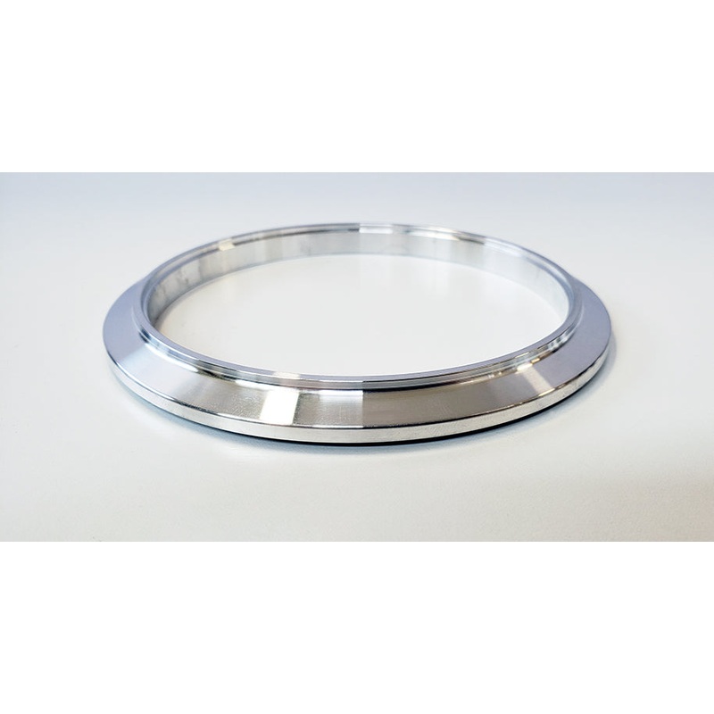 The ultra-thin 0.375″ thick V-Band Flange (left) vs a standard 0.790″ thick V-Band Flange (right).