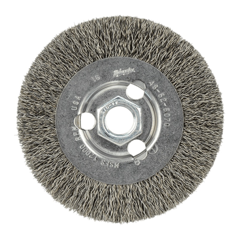 Milwaukee Hyperwire wire brush products offer faster material removal and greater life yet maintain a finer finish. For maximum weld cleaning in confined area, the narrow faced stringer bead wheel provides aggressive action. A tight twist provides the narrow profile with the required stiffness to clean pipe joints in fabrication shops and pipeline maintenance. Stringer bead wheels are available in both carbon and stainless steel. This stringer bead wheel is designed for use on 4-1/2 or 5 in. Milwaukee and competitive grinders with 5/8 – 11 threaded spindles. Made of carbon steel.