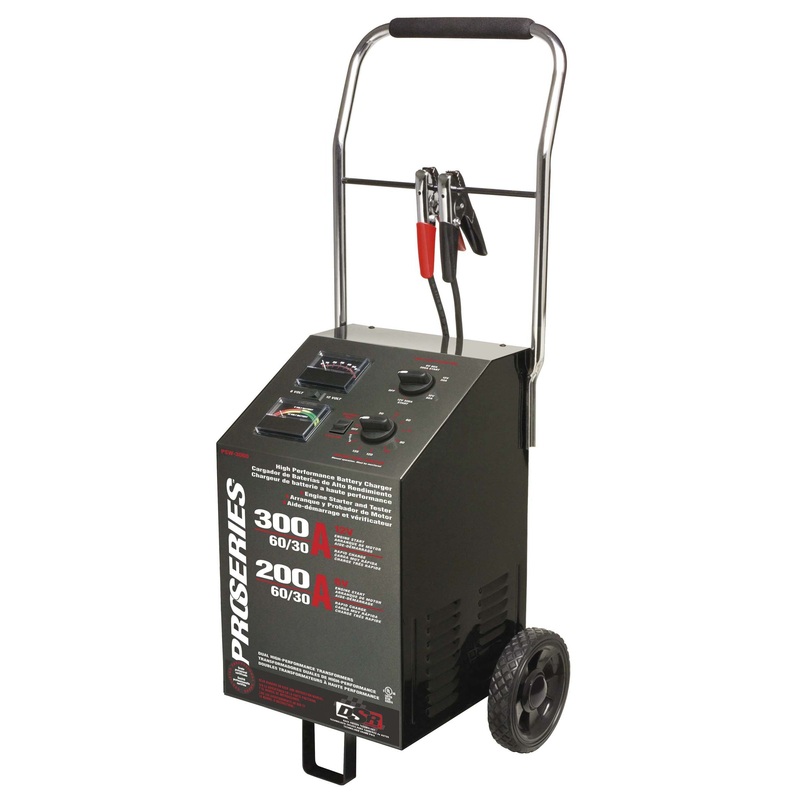 • Additional features include, 2.25 hour timer, oversized selector switches, clamp holder, rubber grip and an extra long 9 foot AC line cordSchumacher’s PSW-3060 Manual ProSeries Wheel Battery Charger/Starter charges 6 and 12 Volt batteries, with 60 and 30 ampere charge rates. For 6 Volt batteries, there is a 200 ampere starting charge, and for 12 Volt batteries a 300 ampere starting charge. This Battery Charger/Starter has a 2.25 hour timer, built-in load tester, rubber grip, 9 foot AC line cord and a convenient clamp holder.