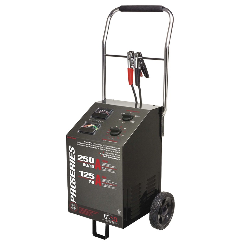 - Additional features include, oversized selector switches, clamp holder, rubber grip and an extra long 9 foot AC line cordSchumacher’s PSW-2550 Manual ProSeries Wheel Battery Charger/Starter charges 6 and 12 Volt batteries. For 6 Volt batteries, there is a 125 ampere starting charge, and a 50 ampere charge rate. For 12 Volt batteries, there is a 250 ampere starting charge, with 50 and 10 ampere charge rates. Additional features include, 2.25 hour timer, oversized selector switches, clamp holder, rubber grip and an extra long 9 foot AC line cord.