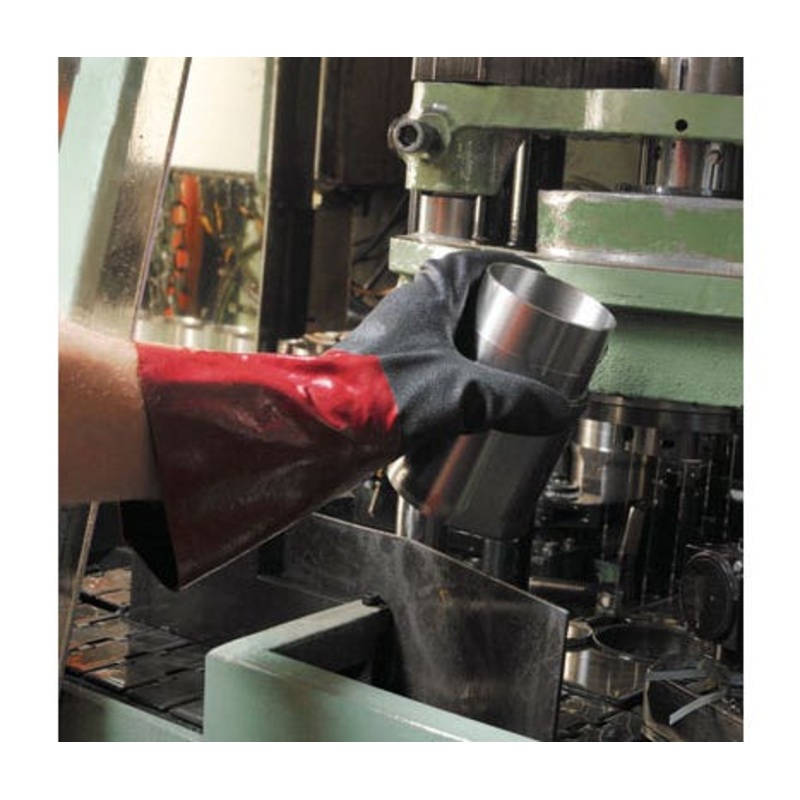 Chemical protection gloves are a durable chemical-resistant gloves with heightened grip, ideal for outdoor application. Recommended for metalworking and assembly operations, body painting including surface inspection, applying sealers, touching up, changing tools and dies, handling application and cleaning tools, warehousing of raw materials, loading and unloading trucks and vehicles, filling, blending and charging of raw materials, transferring liquids and solids, loading and unloading of process equipment, transferring liquids and solids between vessels and tanks and process equipment, supervision of running operation and handling outgoing goods – cans, vessels, bulk pack and cartons. Opening furnaces draining pumps valves or lines and crackers BTX process.