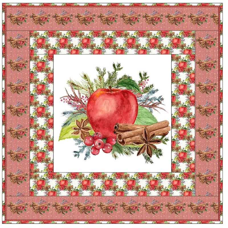 The Apple Cinnamon Spice Wall Hanging includes everything that you need to make the quilt – the instructions and a total of 4 yards of fabric and a 23″ panel. It has two borders and is finished with a flange binding. Batting is sold separately. The finished size of this quilt is 42″ x 42″.