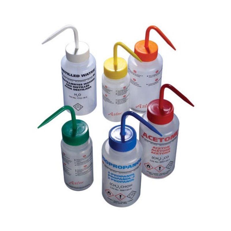 Wide neck, wash bottle. Labels include: Globally Harmonised Symbols, NFPA diamond, risk phrases and safety information. Fitted with colour coded one-piece PP closure to maintain shape in use. Closure feature precision jet-tip aperture for fine control.