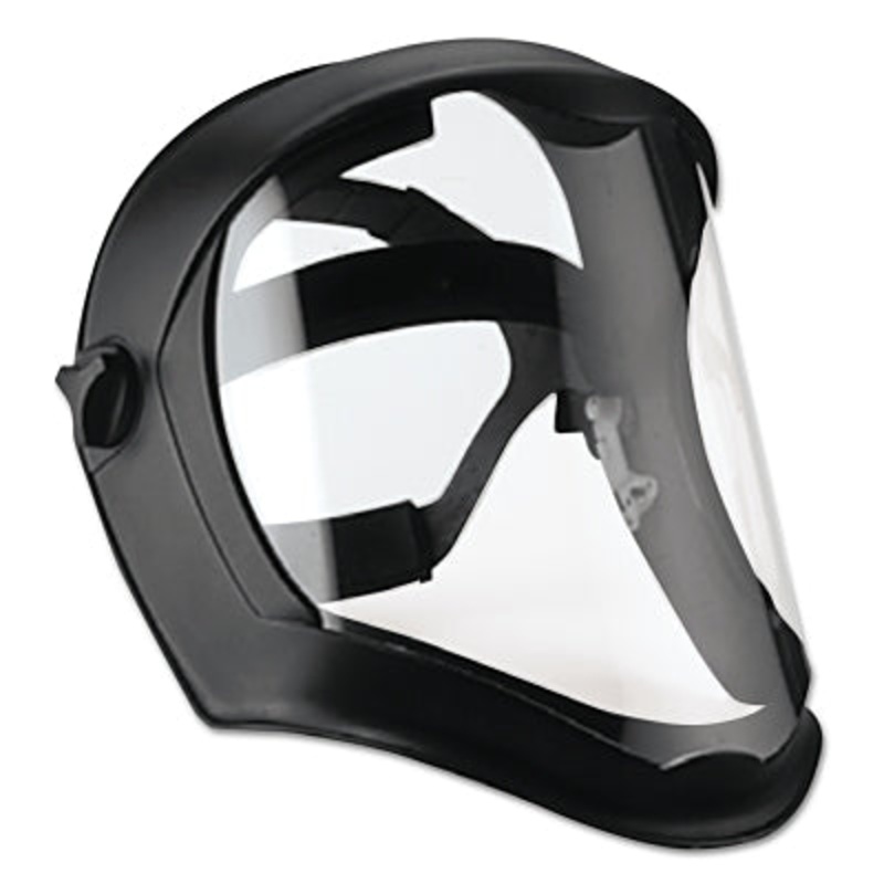 Lightweight face shield with hard hat adapter. Provides reliable protection from airborne debris. Extended visor protects full face and chin. . .