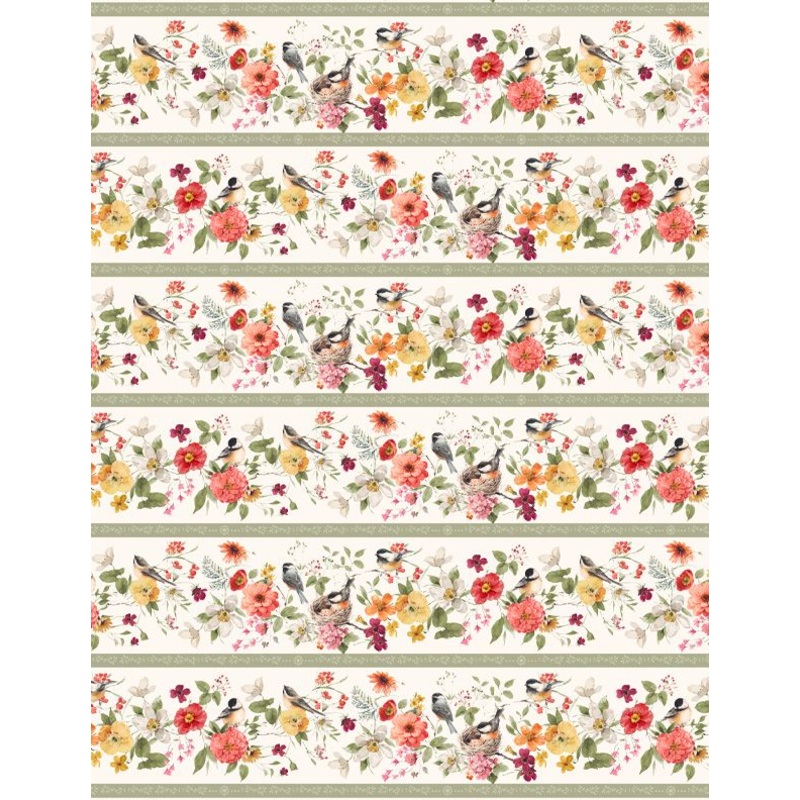Lisa Audits sophisticated floral collection Blessed by Nature features the natural effect of an English garden with mixed flowers and flitting birds in soft dusty colors of peach, gold, green, and blue.