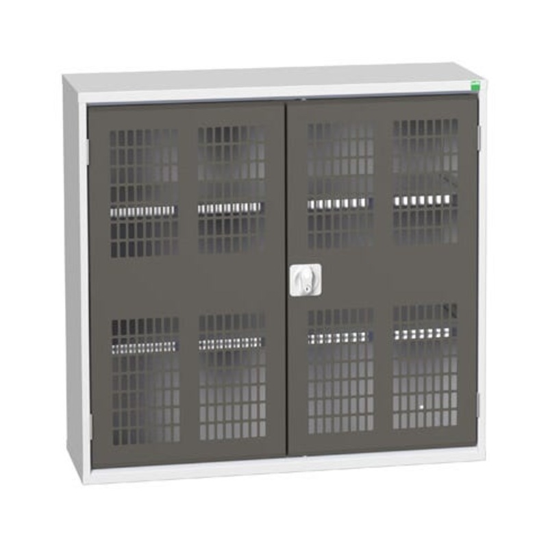 verso wall / shelf cupboard. Featuring a robust, fully welded steel housing with double, ventilated, doors with 2 adjustable height, galvanised steel shelves (75kg U.D.L.). Finished in durable powder coat paint in RAL 7035 light grey / RAL 7016 anthracite grey. WxDxH: 1050x350x1000mm.