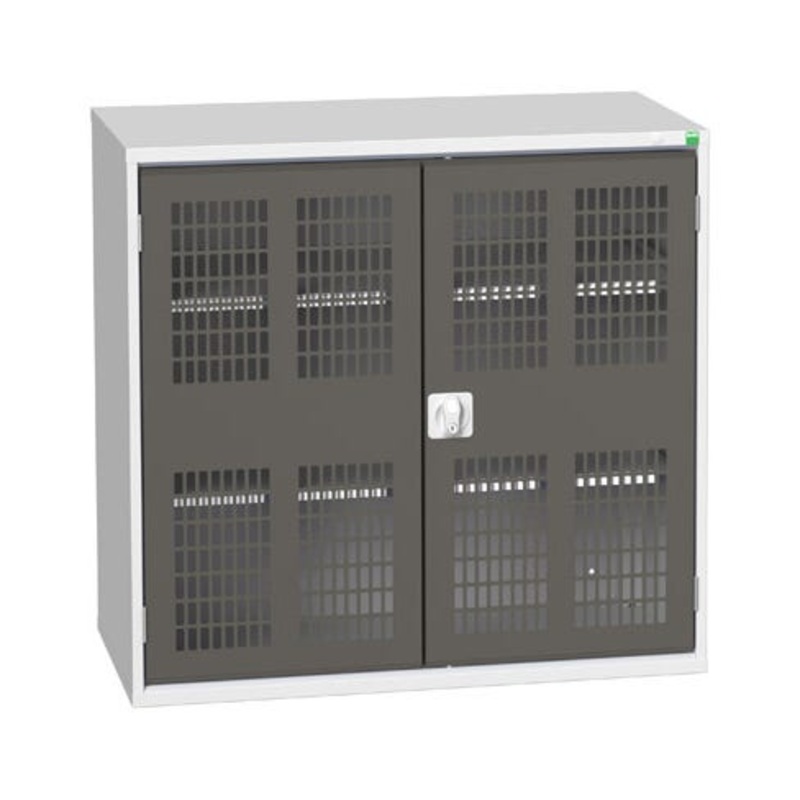verso shelf cupboard. Featuring a robust, fully welded steel housing with double, ventilated, doors with 2 adjustable height, galvanised steel shelves (75kg U.D.L.). Finished in durable powder coat paint in RAL 7035 light grey / RAL 7016 anthracite grey. WxDxH: 1050x550x1000mm.