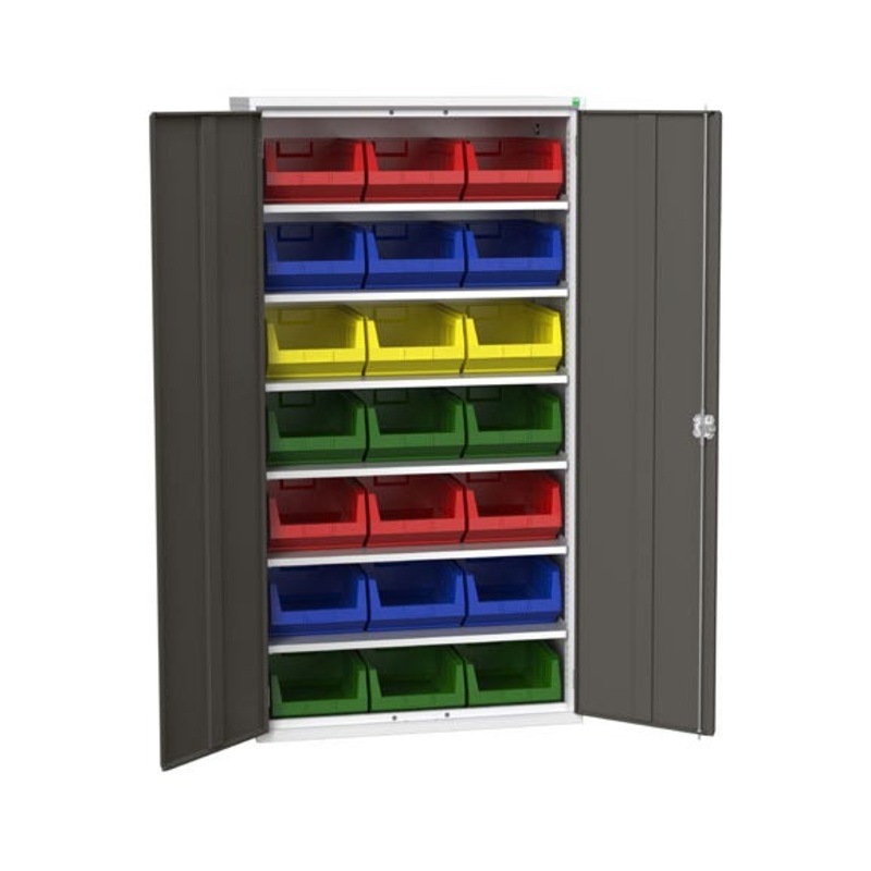verso bin cupboard. Featuring a robust, fully welded steel housing with double, reinforced doors with 6 adjustable height, galvanised steel shelves (75kg U.D.L.) and a 21 piece No.5 bin kit (mixed colours). Finished in durable powder coat paint in RAL 7035 light grey / RAL 7016 anthracite grey. WxDxH: 1050x550x2000mm.