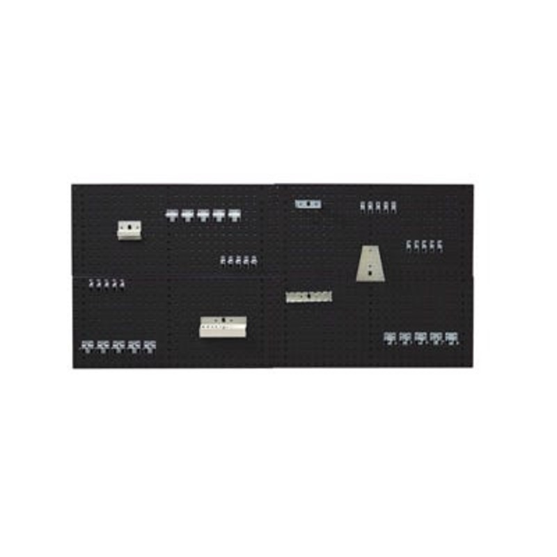 perfo panel and hook kit. Fully flanged and reinforced steel panel for wall mounting, punched with perfo hole pattern, consists of 4x 1.0M panels and 40 piece hook kit. Finished in durable powder coat paint in RAL 7016 anthracite grey. WxDxH: 1000x200x2000mm