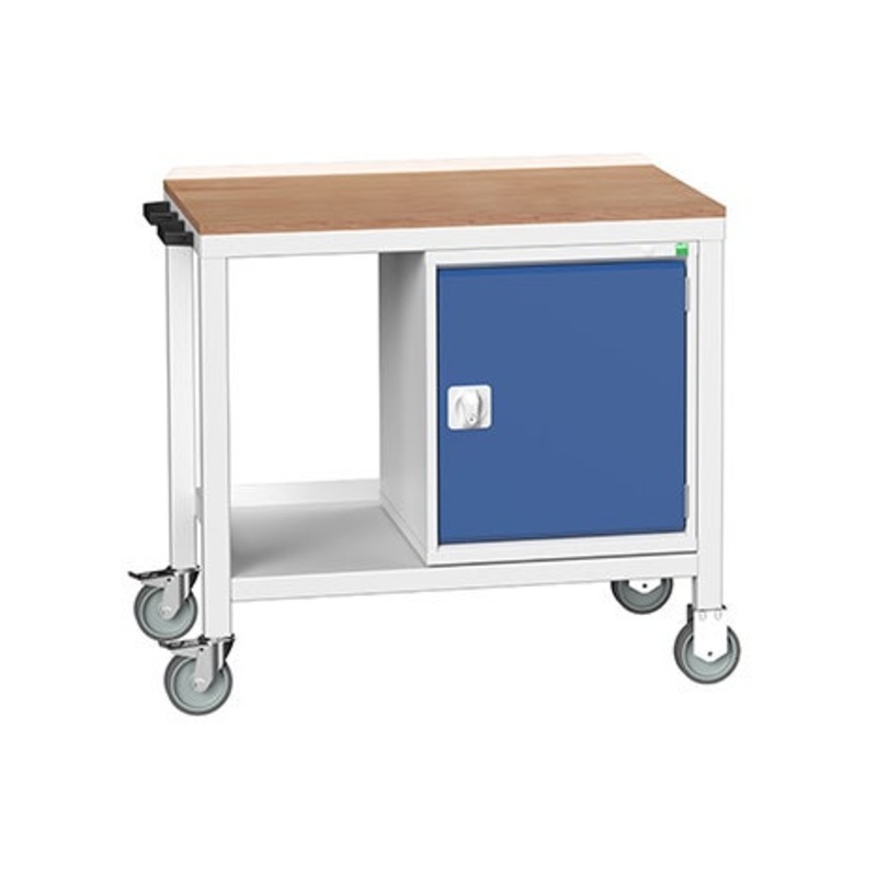 verso mobile welded bench 1000x600x930mm with 30mm Mpx worktop. Fitted with 4 rubber tyred castors, 2 fixed, 2 swivel. 250 kg U.D.L. load capacity with a light grey / blue (RAL 7035 / 5010) powder coated finish. Complete with 1 x 600mm high cupboard