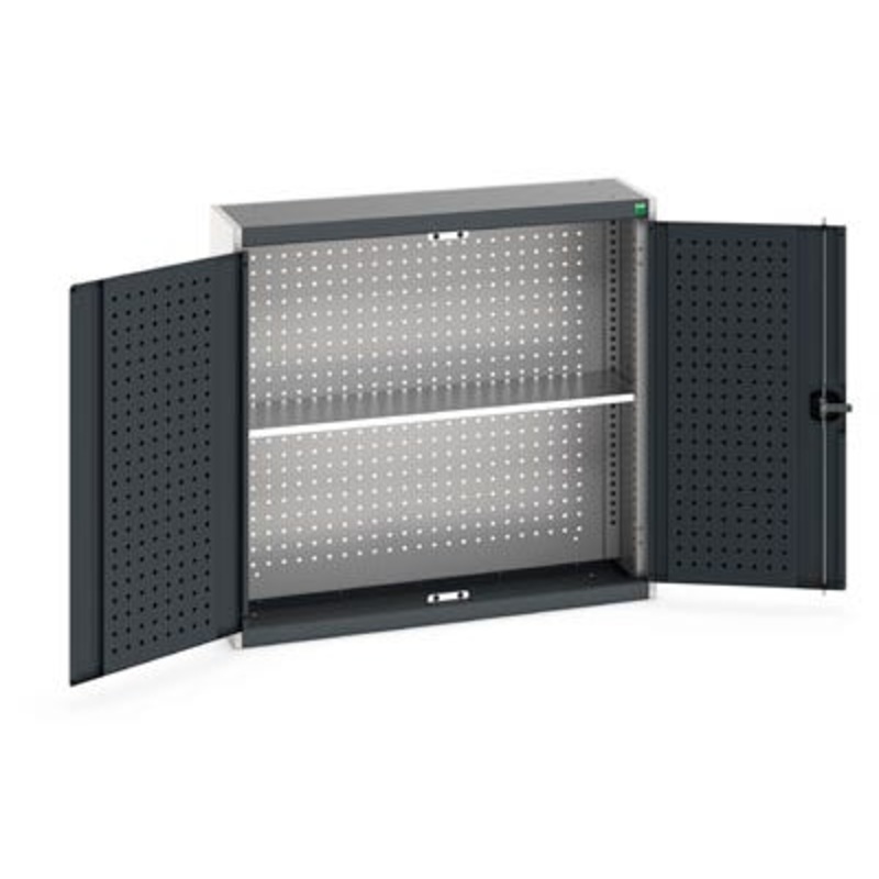 cubio wall cupboard. Featuring a heavy duty, reinforced steel housing with up to 1 tonne total capacity with double, perfo panel lined, reinforced doors with perfo backpanel. Finished in durable powder coat paint in RAL 7035 light grey / RAL 7016 anthracite grey. WxDxH: 1050x325x1000mm
