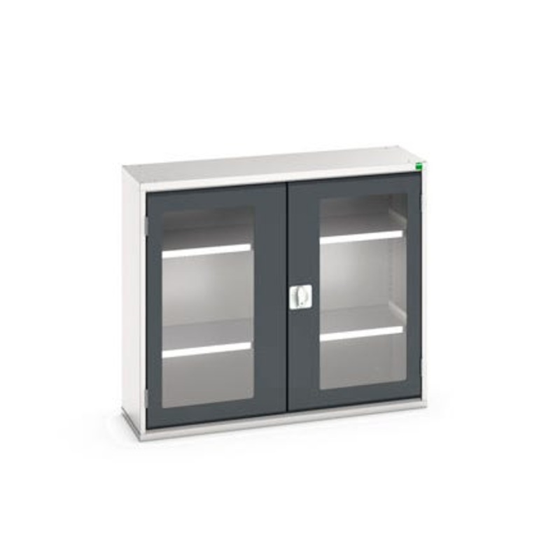 verso wall / shelf cupboard. Featuring a robust, fully welded steel housing with double, window panel, doors with 2 adjustable height, galvanised steel shelves (75kg U.D.L.). Finished in durable powder coat paint in RAL 7035 light grey / RAL 7016 anthracit