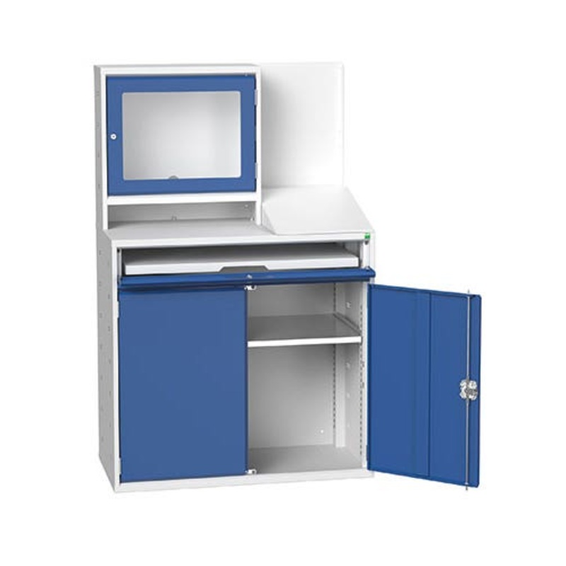 verso computer cupboard with monitor cupboard. Features a robust, fully welded steel housing with lockable, ventilated monitor cupboard with window door, writing top and backpanel, lockable cupboard, and lockable slide out keyboard tray. with 1 adjustable height, galvanised steel shelf (75kg U.D.L.). Finished in durable powder coat paint in RAL 7035 light grey / RAL 5010 gentian blue. WxDxH: 1050x550x1650mm.