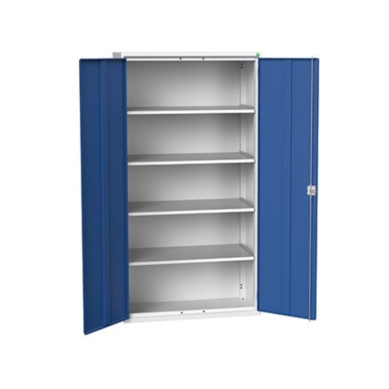 verso shelf cupboard. Featuring a robust, fully welded steel housing with double, reinforced doors with 4 adjustable height, galvanised steel shelves (75kg U.D.L.). Finished in durable powder coat paint in RAL 7035 light grey / RAL 5010 gentian blue. WxDxH: 1050x550x2000mm.