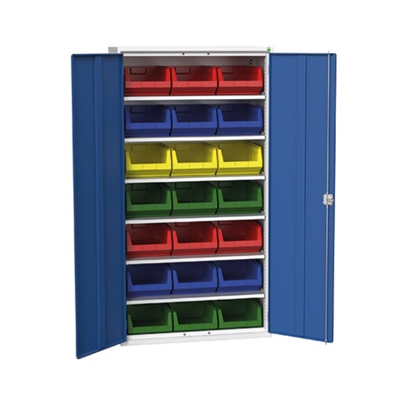 verso bin cupboard. Featuring a robust, fully welded steel housing with double, reinforced doors with 6 adjustable height, galvanised steel shelves (75kg U.D.L.) and a 21 piece No.5 bin kit (mixed colours). Finished in durable powder coat paint in RAL 7035 light grey / RAL 5010 gentian blue. WxDxH: 1050x550x2000mm.