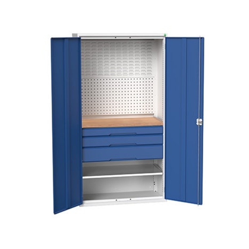 verso mini workshop cupboard. Featuring a robust, fully welded steel housing with double, reinforced doors with 1 adjustable height, galvanised steel shelf (75kg U.D.L.), a multiplex worktop / shelf, 1x perfo, 1x louvre backpanels, and 1x 100mm, 1x 125mm, 1x 175mm drawers with 100% extension slides (75kg U.D.L.). Finished in durable powder coat paint in RAL 7035 light grey / RAL 5010 gentian blue. WxDxH: 1050x550x2000mm.