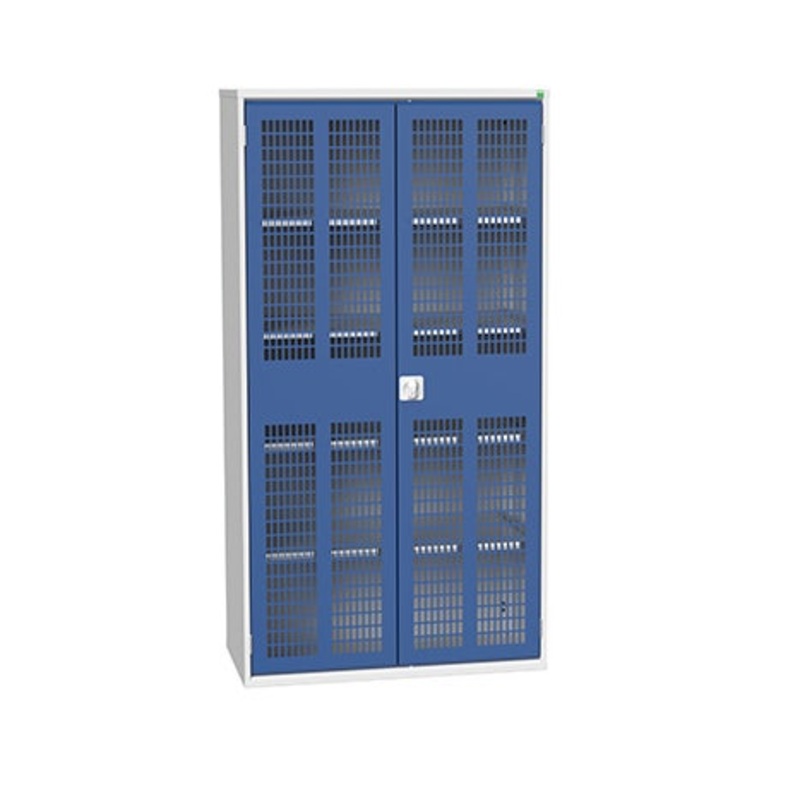 verso shelf cupboard. Featuring a robust, fully welded steel housing with double, ventilated, doors with 4 adjustable height, galvanised steel shelves (75kg U.D.L.). Finished in durable powder coat paint in RAL 7035 light grey / RAL 5010 gentian blue. WxDxH: 1050x550x2000mm.
