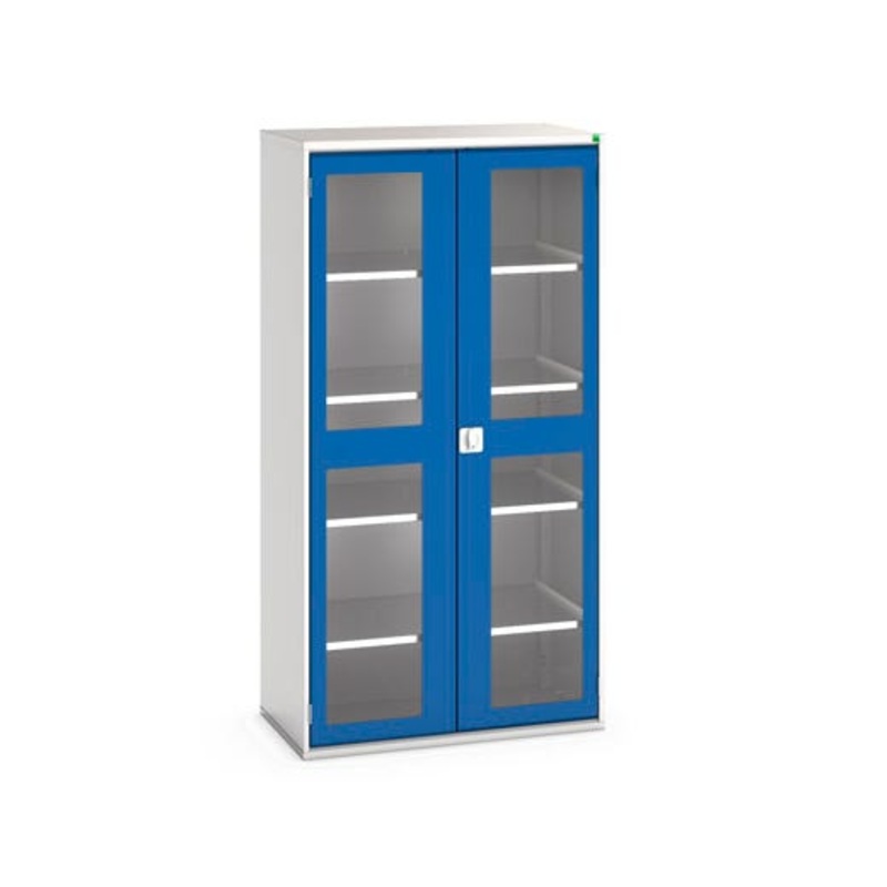 verso shelf cupboard. Featuring a robust, fully welded steel housing with double, window panel, doors with 4 adjustable height, galvanised steel shelves (75kg U.D.L.). Finished in durable powder coat paint in RAL 7035 light grey / RAL 5010 gentian blue. WxDxH: 1050x550x2000mm.