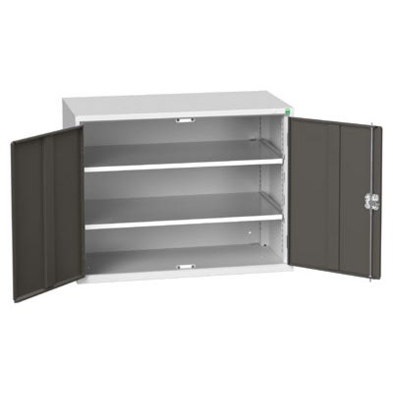 verso shelf cupboard. Featuring a robust, fully welded steel housing with double, reinforced doors with 2 adjustable height, galvanised steel shelves (75kg U.D.L.). Finished in durable powder coat paint in RAL 7035 light grey / RAL 7016 anthracite grey. WxDxH: 1050x550x800mm.