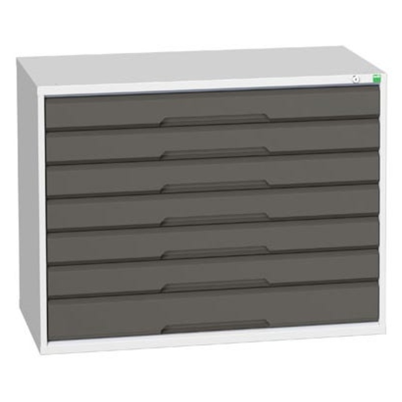 verso drawer cabinet with 7 drawers. Featuring a robust, fully welded steel housing with 100% extension drawers. Drawer configuration: 6x 100mm, 1x 125mm (75kg U.D.L.). Finished in durable powder coat paint in RAL 7035 light grey / RAL 7016 anthracite grey. WxDxH: 1050x550x800mm.