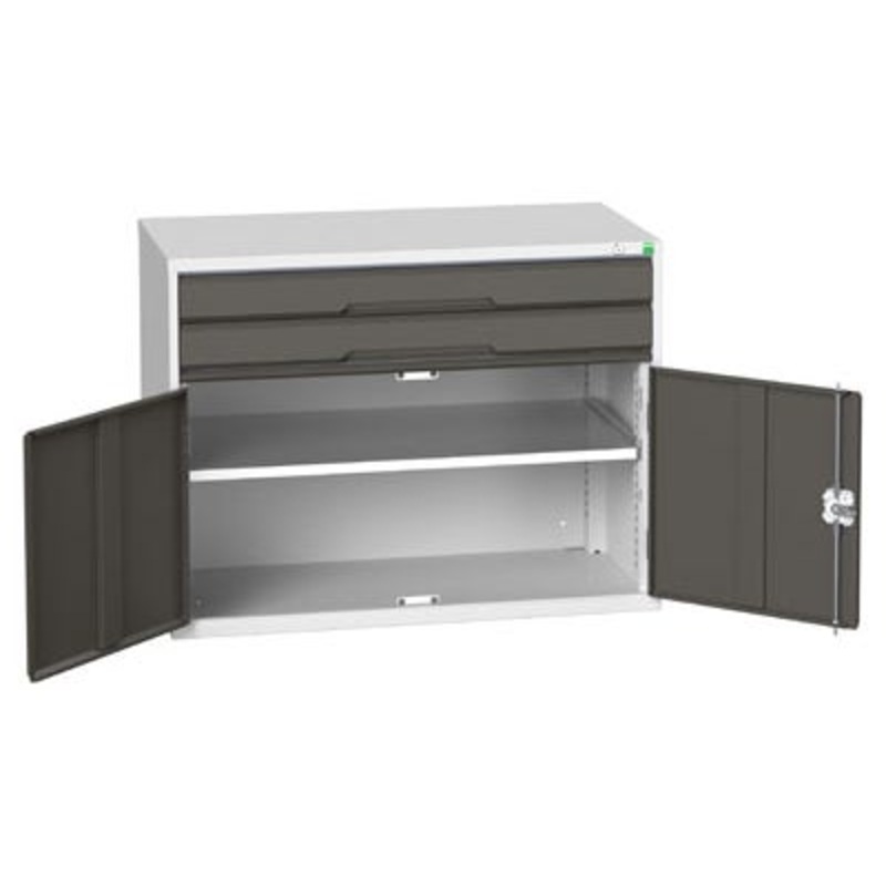 verso drawer-door cabinet with 2 drawers / cupboard. Featuring a robust, fully welded steel housing with 100% extension drawers. Drawer configuration: 2x 100mm (75kg U.D.L.). Cupboard section has double, reinforced, doors and 1 galvanised steel shelf (75kg U.D.L.). Finished in durable powder coat paint in RAL 7035 light grey / RAL 7016 anthracite grey. WxDxH: 1050x550x800mm.