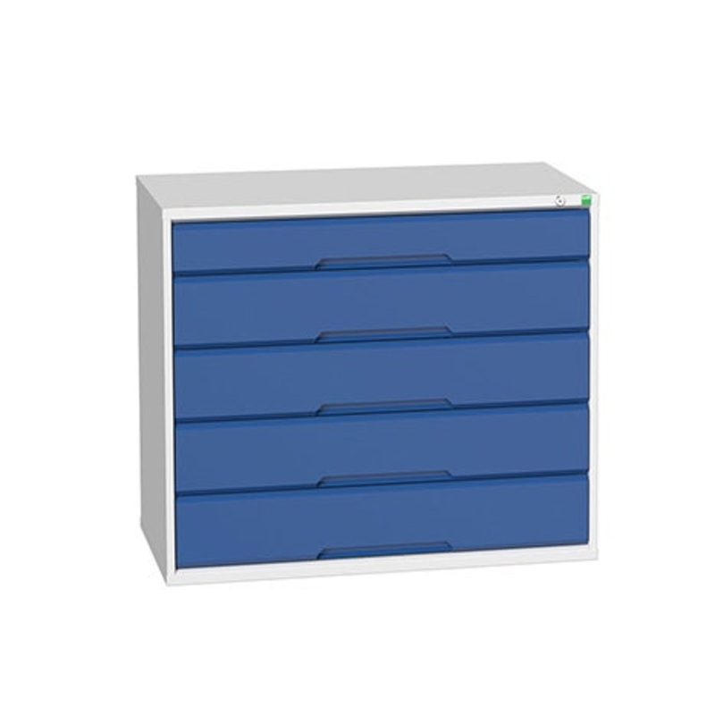 verso drawer cabinet with 5 drawers. Featuring a robust, fully welded steel housing with 100% extension drawers. Drawer configuration: 1x 125mm, 4x 175mm (75kg U.D.L.). Finished in durable powder coat paint in RAL 7035 light grey / RAL 5010 gentian blue. WxDxH: 1050x550x900mm.