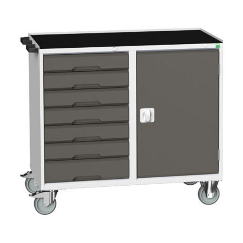 verso maintenance trolley with 7 drawers / cupboard & top tray with mat. Featuring a robust, fully welded steel housing with double, independent, storage sections, push – pull handles, 100% extension drawers with drawer blocking and 125mm diameter castors. Drawer configuration: 6x 100mm, 1x 125mm (50kg U.D.L.). and cupboard section with single, reinforced, door and 1 galvanised steel shelf (75kg U.D.L.). Finished in durable powder coat paint in RAL 7035 light grey / RAL 7016 anthracite grey. WxDxH: 1050x550x965mm