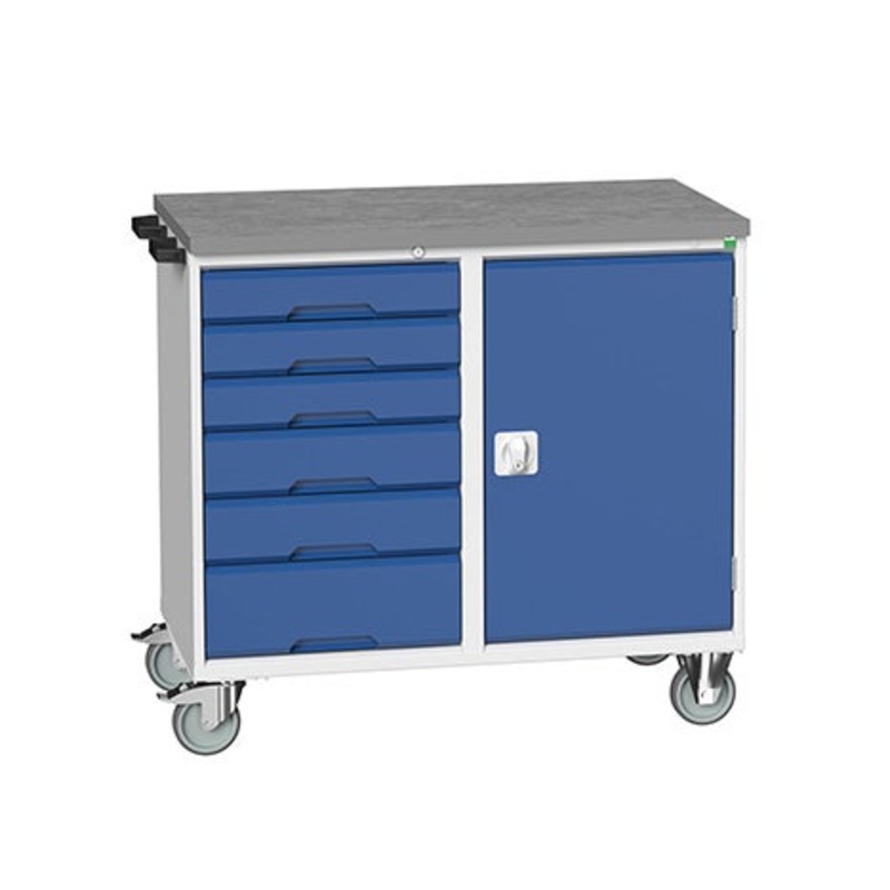 verso maintenance trolley with 6 drawers / cupboard & lino top. Featuring a robust, fully welded steel housing with double, independent, storage sections, push – pull handles, 100% extension drawers with drawer blocking and 125mm diameter castors. Drawer configuration: 3x 100mm, 2x 125mm, 1x 175mm (50kg U.D.L.). and cupboard section with single, reinforced, door and 1 galvanised steel shelf (75kg U.D.L.). Finished in durable powder coat paint in RAL 7035 light grey / RAL 5010 gentian blue. WxDxH: 1050x600x980mm