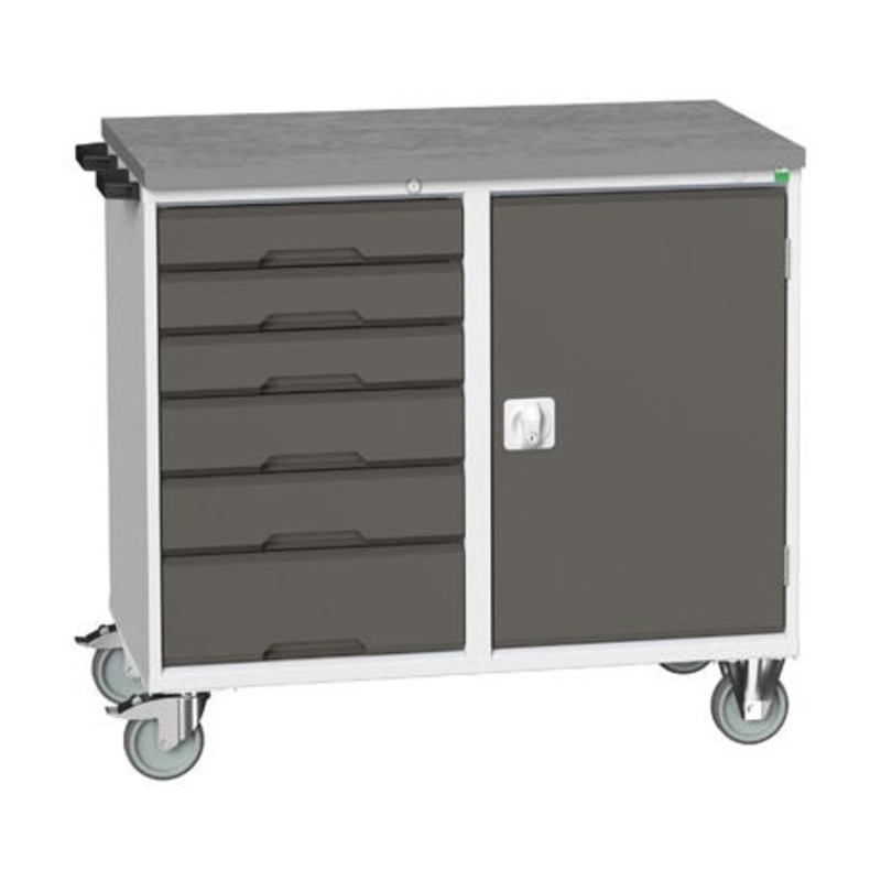 verso maintenance trolley with 6 drawers / cupboard & lino top. Featuring a robust, fully welded steel housing with double, independent, storage sections, push – pull handles, 100% extension drawers with drawer blocking and 125mm diameter castors. Drawer configuration: 3x 100mm, 2x 125mm, 1x 175mm (50kg U.D.L.). and cupboard section with single, reinforced, door and 1 galvanised steel shelf (75kg U.D.L.). Finished in durable powder coat paint in RAL 7035 light grey / RAL 7016 anthracite grey. WxDxH: 1050x600x980mm