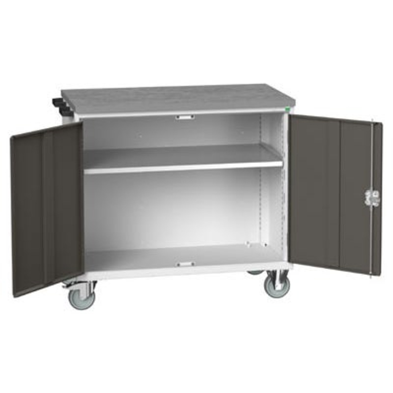 verso mobile cupboard with 1x shelf & lino top. Featuring a robust, fully welded steel housing with push – pull handle and 125mm diameter castors. Cupboard section has double, reinforced, doors and 1 galvanised steel shelf (75kg U.D.L.). Finished in durable powder coat paint in RAL 7035 light grey / RAL 7016 anthracite grey. WxDxH: 1050x600x980mm