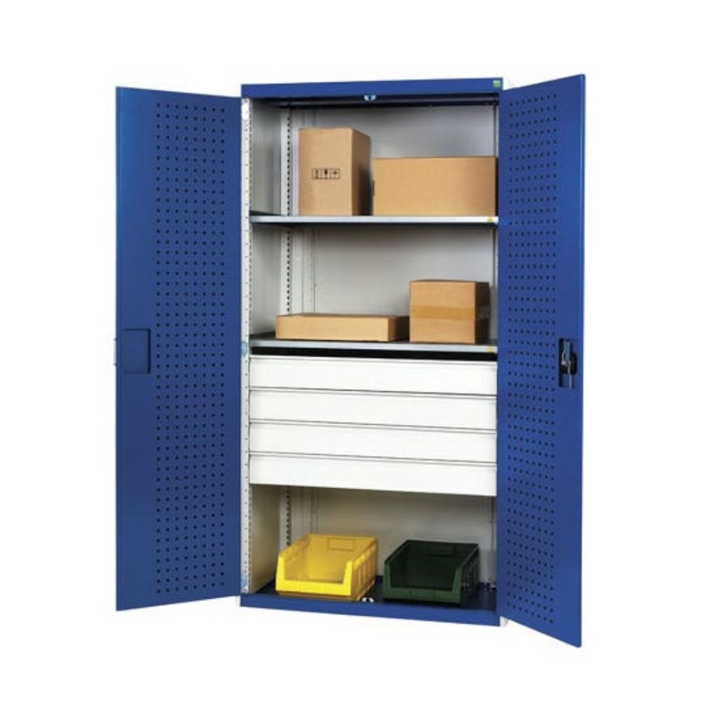 cubio kitted cupboard. Featuring a heavy duty, reinforced steel housing with up to 1.5 tonne total capacity with double, perfo panel lined, reinforced doors with 2 adjustable height, galvanised steel shelves (100kg U.D.L.), 4x 125mm drawers with 100% extension slides (75kg U.D.L.). Finished in durable powder coat paint in RAL 7035 light grey / RAL 5010 gentian blue. WxDxH: 1050x650x2000mm.
