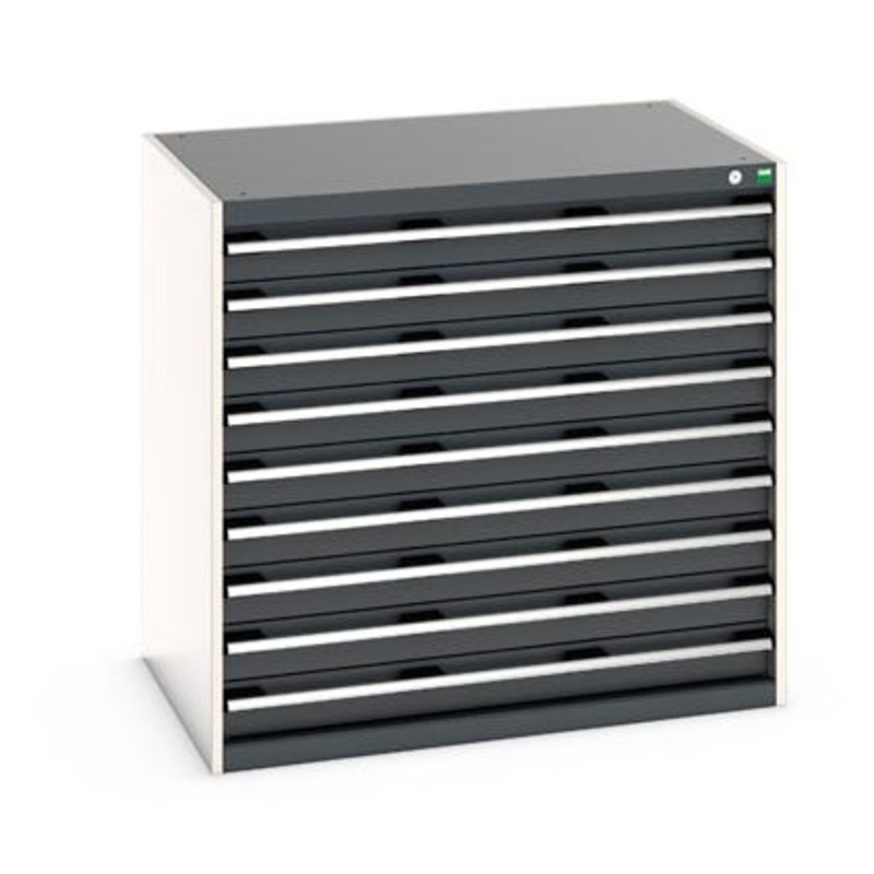 cubio drawer cabinet with 9 drawers. Featuring a heavy duty, reinforced steel housing with up to 1.5 tonne total capacity and 100% extension drawers. Drawer configuration: 9x 100mm (75kg U.D.L.). Finished in durable powder coat paint in RAL 7035 light grey / RAL 7016 anthracite grey. WxDxH: 1050x750x1000mm.