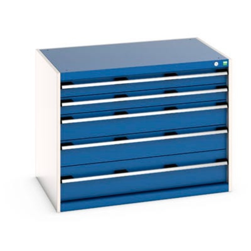 cubio drawer cabinet with 5 drawers. Featuring a heavy duty, reinforced steel housing with up to 1.5 tonne total capacity and 100% extension drawers. Drawer configuration: 2x 100mm, 2x 150mm, 1x 200mm (75kg U.D.L.). Finished in durable powder coat paint in RAL 7035 light grey / RAL 5010 gentian blue. WxDxH: 1050x750x800mm.