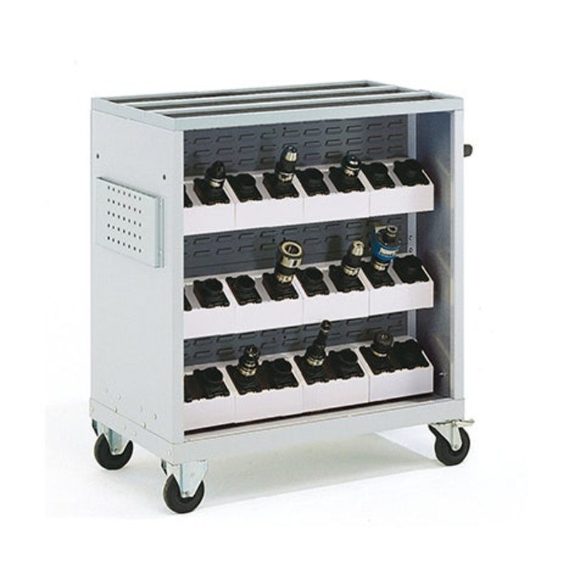 CNC panel trolley. Robust design with central louvre panels and 3 piece top tray with mat, suitable for up to 24 tool blocks. Finished in durable powder coat paint in RAL 7035 light grey / RAL 5010 gentian blue. WxDxH: 1115x600x1150 mm. Brand:Bott Manufact