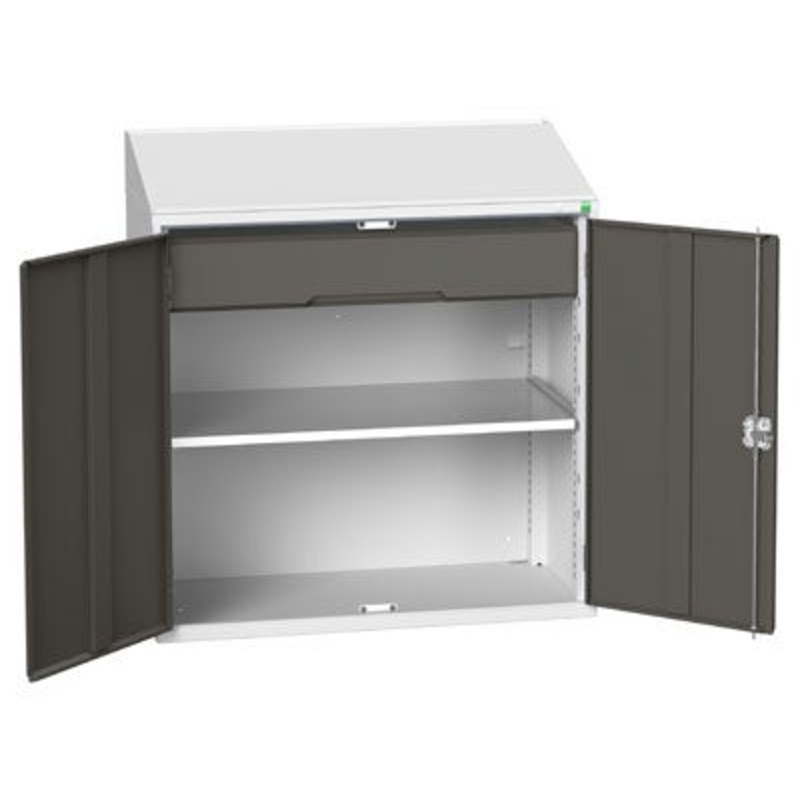 verso lectern cupboard. Featuring a robust, fully welded steel housing with sloping top writing top a lockable cupboard and double, reinforced doors with 1 adjustable height, galvanised steel shelf (75kg U.D.L.) and 1x 175mm drawer with 100% extension slides (75kg U.D.L.). Finished in durable powder coat paint in RAL 7035 light grey / RAL 7016 anthracite grey. WxDxH: 1050x550x1130mm.
