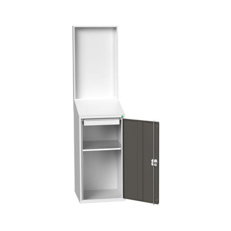verso economy lectern cupboard with backpanel. Featuring a welded steel housing with sloping writing top, a lockable cupboard and single, reinforced door with 1 adjustable height, galvanised steel shelf (35kg U.D.L.) 1x 75mm drawer (10kg U.D.L.) and rear, backpanel frame. Finished in durable powder coat paint in RAL 7035 light grey / RAL 7016 anthracite grey. WxDxH: 525x550x2000mm.