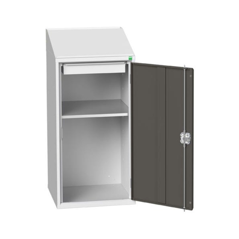 verso economy lectern cupboard. Featuring a welded steel housing with sloping writing top, a lockable cupboard and single, reinforced door with 1 adjustable height, galvanised steel shelf (35kg U.D.L.) and 1x 75mm drawer (10kg U.D.L.). Finished in durable powder coat paint in RAL 7035 light grey / RAL 7016 anthracite grey. WxDxH: 525x550x1130mm.