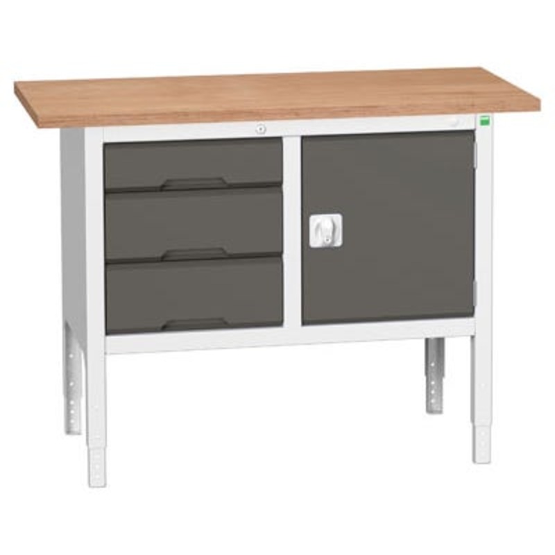 Verso height adjustable storage bench 1250mm x 600mm x 830 - 930mm with mpx worktop Brand:Bott Manufacturer Part Number:16923003 Colour:Light Grey / Anthracite Grey Height (mm):830 Depth (mm):600 Width (mm):1250