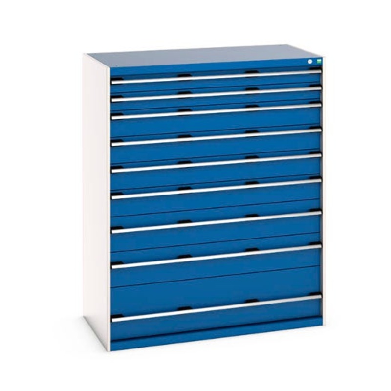 cubio drawer cabinet with 9 drawers. Featuring a heavy duty, reinforced steel housing with up to 1.5 tonne total capacity and 100% extension drawers. Drawer configuration: 2x 100mm, 4x 150mm, 2x 200mm, 1x 300mm (75kg U.D.L.). Finished in durable powder coat paint in RAL 7035 light grey / RAL 5010 gentian blue. WxDxH: 1300x750x1600mm.