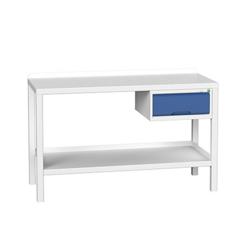 verso welded bench 1500x600x910mm with steel worktop. With 750 kg U.D.L. load capacity and constructed of sheet steel with a hardwearing light grey / blue (RAL 7035 / 5010) powder coated finish. Supplied with 1 x 250mm drawer with 60KG UDL Brand:Bott Type: