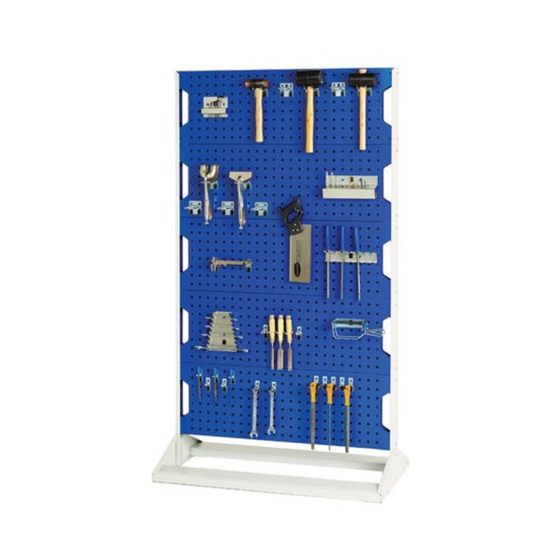 perfo panel rack (double sided). Robust steel construction, with wide stable base and panels to both sides. Consists of 10 panels and 80 piece hook kit. Finished in durable powder coat paint in RAL 7035 light grey / RAL 5010 gentian blue. WxDxH: 1000x550x1775mm