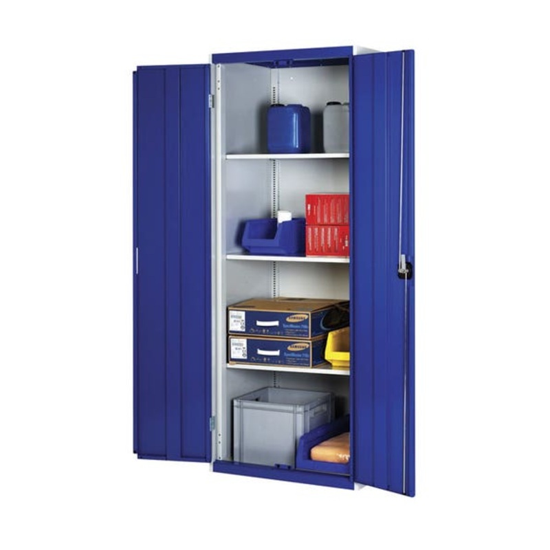cubio standard duty shelf cupboard. Featuring a standard duty, steel housing with double, reinforced doors with 2 adjustable height, galvanised steel shelves (75kg U.D.L.). Finished in durable powder coat paint in RAL 7035 light grey / RAL 5010 gentian blue. WxDxH: 800x525x1000mm.