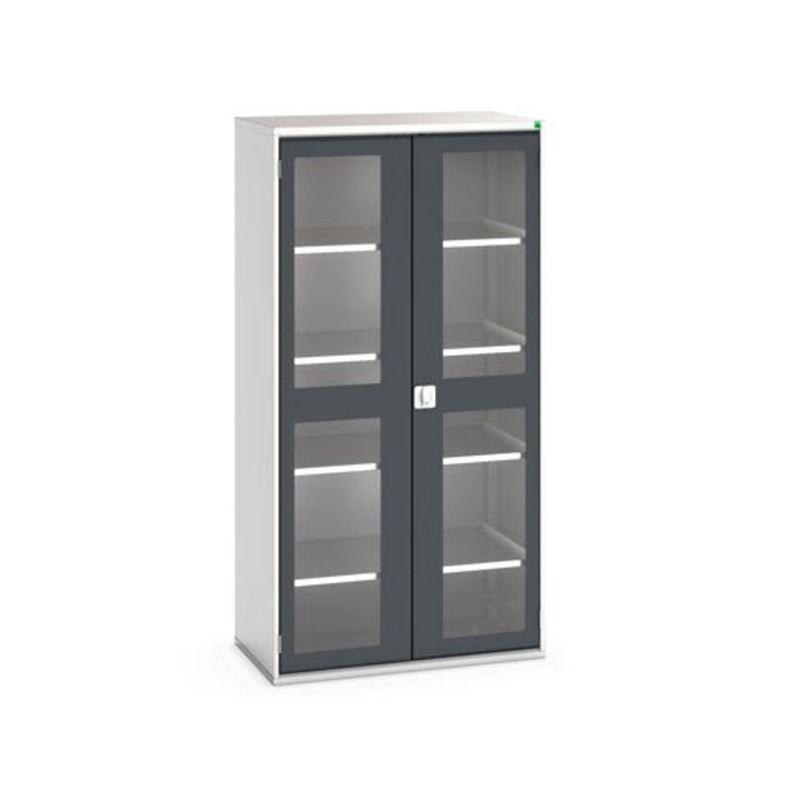 verso shelf cupboard. Featuring a robust, fully welded steel housing with double, window panel, doors with 4 adjustable height, galvanised steel shelves (75kg U.D.L.). Finished in durable powder coat paint in RAL 7035 light grey / RAL 7016 anthracite grey. WxDxH: 1050x550x2000mm.