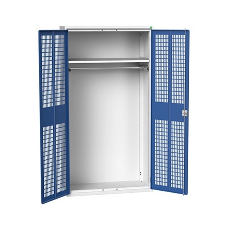 verso ventilated door PPE / janitorial kitted cupboard. Featuring a robust, fully welded steel housing and double, Ventilated doors with 1 adjustable height, galvanised steel shelf (75kg U.D.L.) and a hanging rail. Finished in durable powder coat paint in RAL 7035 light grey / RAL 5010 gentian blue. WxDxH: 1050x550x2000mm.