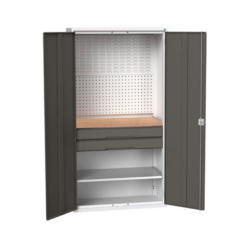 verso mini workshop cupboard. Featuring a robust, fully welded steel housing with double, reinforced doors with 1 adjustable height, galvanised steel shelf (75kg U.D.L.), a multiplex worktop / shelf, 1x perfo, 1x louvre backpanels, and 2x 125mm drawers with 100% extension slides (75kg U.D.L.). Finished in durable powder coat paint in RAL 7035 light grey / RAL 7016 anthracite grey. WxDxH: 1050x550x2000mm.