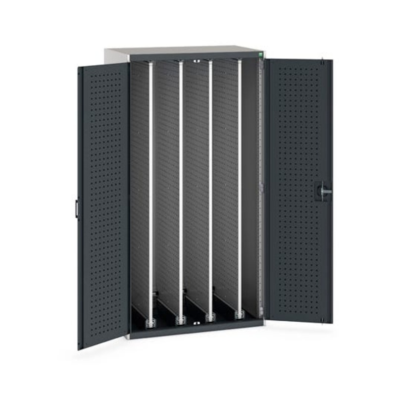 cubio panel cupboard. Featuring a heavy duty, reinforced steel housing with up to 1.5 tonne total capacity with double, perfo panel lined, reinforced doors with 4x sliding vertical perfo panels. Finished in durable powder coat paint in RAL 7035 light grey / RAL 7016 anthracite grey. WxDxH: 1050x650x2000mm