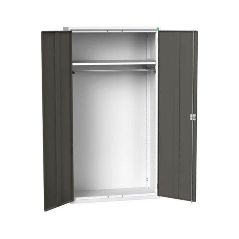 verso PPE / janitorial kitted cupboard. Featuring a robust, fully welded steel housing and double, reinforced doors with 1 adjustable height, galvanised steel shelf (75kg U.D.L.) and a hanging rail. Finished in durable powder coat paint in RAL 7035 light grey / RAL 7016 anthracite grey. WxDxH: 1050x550x2000mm.